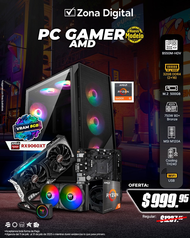 Combo de PC Gamer Ryzen 5 5600X MB B550M Ram ddr4 32GB(2x16gb) M.2 512GB RX9060XT 8GB PSU 750w 80+BR Case Falcon Enfriamiento FrigusAir Conexion WiFi Incluida