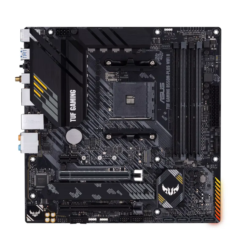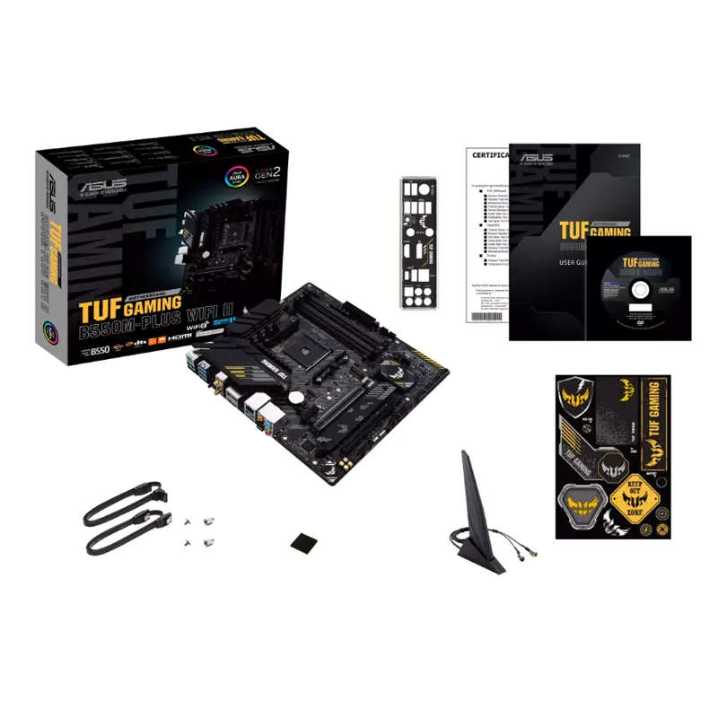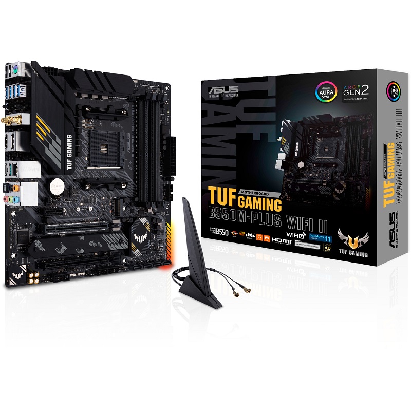 JUEGOS INMERSIVOS: TUF Gaming B550M-Plus WIFI II proporciona un paquete de juegos completo y de alto rendimiento con una larga lista de características para mejorar su experiencia, que incluyen redes ultrarrápidas para un juego en línea más fluido, audio prístino con señales posicionales para juegos FPS e iluminación RGB integrada que se sincroniza con accesorios adjuntos para ayudarlo a crear una atmósfera de juego personalizada.
