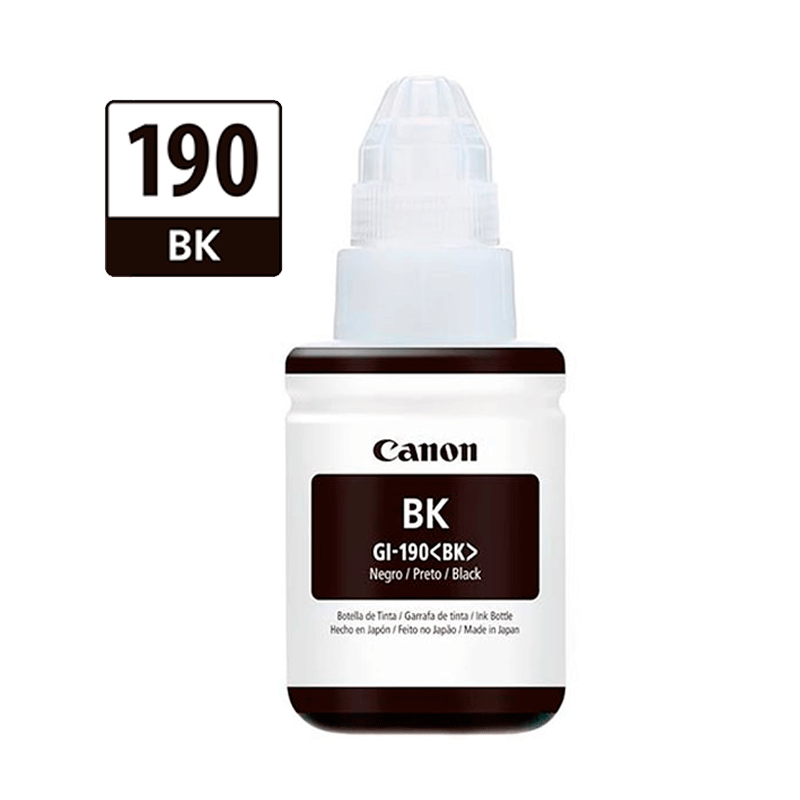 • TINTA CANON PIXMA 190 NEGRO 135ML GI190 135ML. • COMPATIBLE CON IMPRESORES • PIXMA G1100 • PIXMA G1110 • PIXMA G2100 • PIXMA G2110 • PIXMA G3100 • PIXMA G4100 • PIXMA G4110